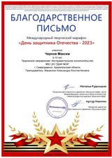 Сегодня очень много возможностей у наших юных музыкантов и художников показать свое творчество и быть активным - это и концерты, и конкурсы, и выставки, и вот еще одно направление - творческие марафоны! Благодарим Максима Чернова и его преподавателя - Александру Константиновну Маканину за участие в международном творческом марафоне "День защитника Отечества - 2023"