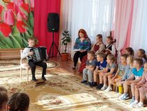 И вновь наш творческий десант в детском саду, новые дети, обновленный состав артистов! Виталий Грушин (баян) , Алиса Кузнецова (народный вокал), Ульяна Галацан (виолончель), Юлия Зубова (фортепиано).