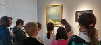 "Путь на север" - выставка, где представлено творчество разных художников, выставка о красоте севера. Ребята увидели работы Шишкина, где всё проработано до мельчайших подробностей. А вот на полотнах Константина Коровина, в отличии от Шишкина, можно было увидеть размашистость мазка и отсутствие деталей, отчего кажется, что мастер еще не завершил свой шедевр. У картины Архипа Куинджи "Ладожское озеро", экскурсантам дали повзаимодействовать с настоящей галькой.
