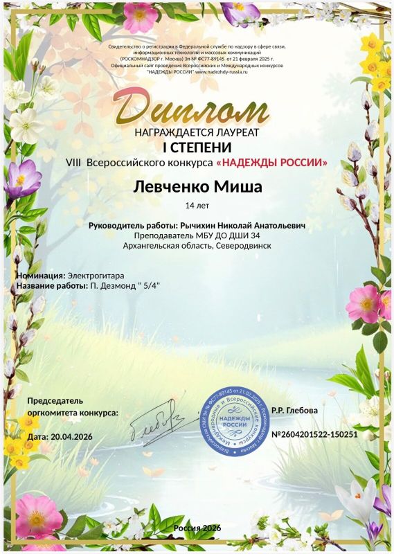 Поздравляем Михаила Левченко, учащегося нашей школы, с блестящим достижением! Михаил стал лауреатом 1 степени на VIII Всероссийском конкурсе «Надежды России»! От всей души благодарим педагога - Рычихина Николая Анатольевича - за профессионализм, поддержку и вклад в успех ученика.